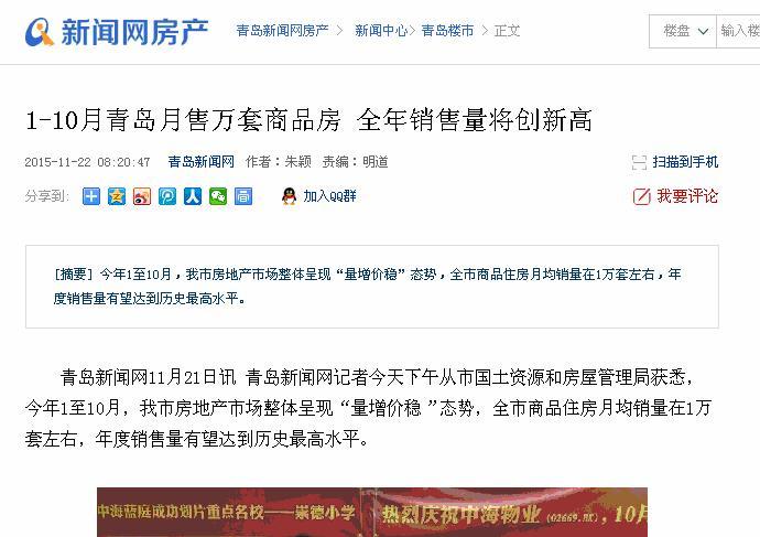 (二)積極回應社會關切。為拓寬信息公開渠道,我局在已經開通官方微博的基礎上,又開通了官方微信。針對社會公眾關注的熱點問題,充分利用官方微博、微信,及時、方便、快捷地為社會公眾提供政府信息。2015年11月,網絡媒體登載的《青島18萬庫存之急》,引發關注,我局第一時間起草了新聞通稿,正面發聲,向社會公布我市房地產市場平穩健康運行的有關信息,并在青島新聞網進行了發布,人民網、大眾網、鳳凰網等相關媒體進行了轉載,及時回應社會的關切,很好的引導輿論。